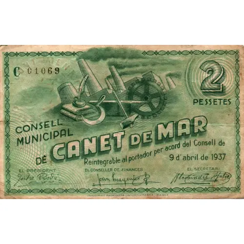 2 PESSETES CONSELL MUNICIPAL DE CANET DE MAR Reintegrable al portador per acord del Consell de 9 d`abril de 1937 (Translation: 2 Pesetas Municipal Council of Canet de Mar Refundable to the bearer by agreement of the Council of April 9, 1937) |