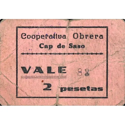 Cooperativa Obrera Cap de Saso VALE 2 pesetas (Translation: Worker Cooperative Cap de Saso It`s worth 2 Pesetas) |
