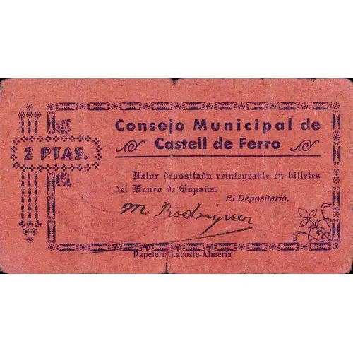 Obverse lettering 2 PTAS. Consejo Municipal de Castell de Ferro Valor depositado reintegrable en billetes del Banco de España.