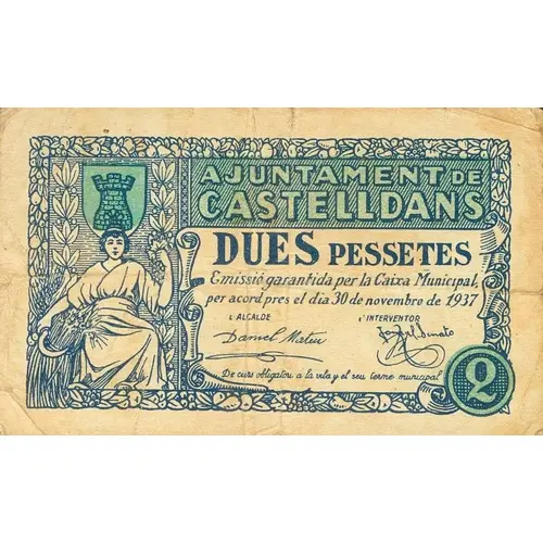 AJUNTAMENT DE CASTELLDANS DUES PESSETES Emissió garantida per la Caixa Municipal per acord pres el dia 30 de novembre de 1937 De curs obligatori a la vila y el seu terme municipal 2 (Translation: City Council of Castelldans Two Pesetas Issue guaranteed by the `Caixa Municipal` by agreement reached on November 30, 1937 Mandatory course in the town and its municipality) |