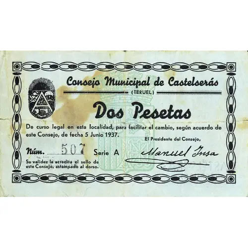 (Translation: Municipal Council of Castelserás (Teruel) Two Pesetas Legal tender in this locality, to facilitate the exchange, according to the agreement of this Council, dated June 5, 1937. Its validity is confirmed by the seal of this Council, stamped on the back.)