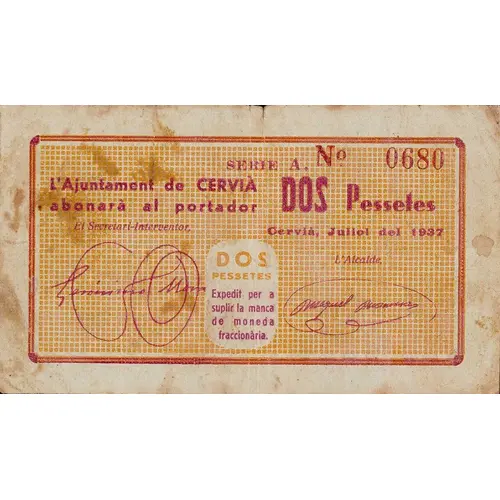 | Obverse lettering | L`Ajuntament de CERVIÀ abonarà al portador DOS Pessetes Cervià, Juliol del 1937 Expedit per a suplir la manca de moneda fraccionària. (Translation: The City Council of Cervià will pay the bearer Two Pesetas Cervià, July 1937 Issued to make up for the lack of fractional currency.) |