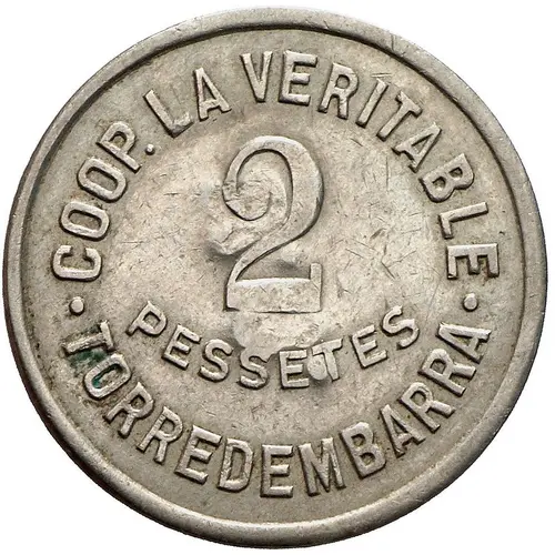 COOP. LA VERITABLE 2 PESSETES · TORREDEMBARRA · (Translation: Cooperative `La Veritabe` 2 Pesetas) |