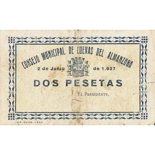 CONSEJO MUNICIPAL DE CUEVAS DEL ALMANZORA 2 de Junio de 1.937 DOS PESETAS (Translation: Municipal Council of Cuevas del Almanzora June 2, 1937. Two Pesetas) |