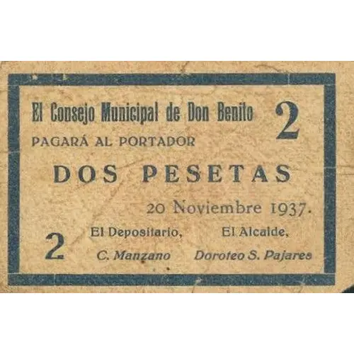 2 El Consejo Municipal de Don Benito PAGARÁ AL PORTADOR DOS PESETAS 20 Noviembre 1937. (Translation: The Municipal Council of Don Benito Will pay the bearer Two Pesetas November 20, 1937.) |