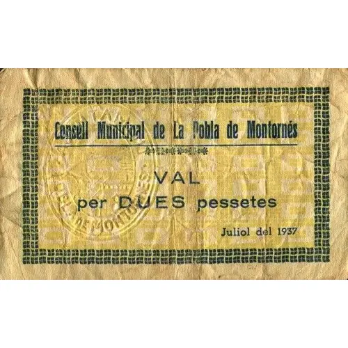 Consell Municipal de La Pobla de Montornés VAL per DUES pessetes Juliol del 1937 (Translation: Municipal Council of La Pobla de Montornés Valid for Two Pesetas July 1937) |