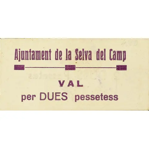 | Obverse lettering | Ajuntament de la Selva del Camp VAL per DUES pessetess (Translation: City Council of La Selva del Camp Valid for Two Pesetas) |