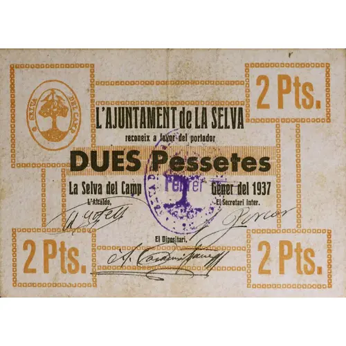 | Obverse lettering | 2 Pts. L`AJUNTAMENT de LA SELVA reconeix a favor del portador DUES Pessetes La Selva del Camp / Gener del 1937 (Translation: 2 Pesetas The City Council of La Selva Recognizes in favor of the bearer Two Pesetas La Selva del Camp / January 1937) |