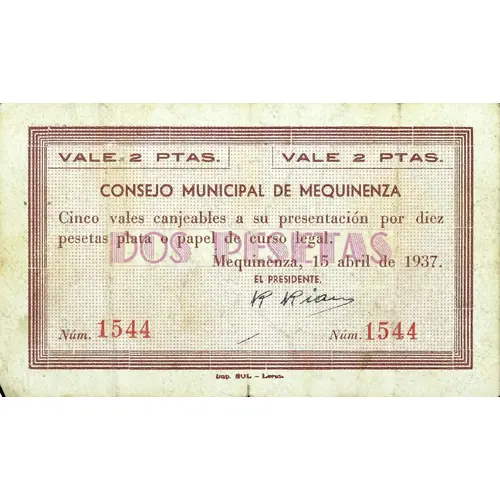 VALE 2 PTAS. CONSEJO MUNICIPAL DE MEQUINENZA Cinco vales canjeables a su presentación por diez pesetas plata o papel de curso legal. Mequinenza, 15 abril de 1937. (Translation: Value 2 Pesetas Municipal Council of Mequinenza Five vouchers exchangeable on presentation for ten silver pesetas or legal tender paper. Mequinenza, April 15, 1937.) |