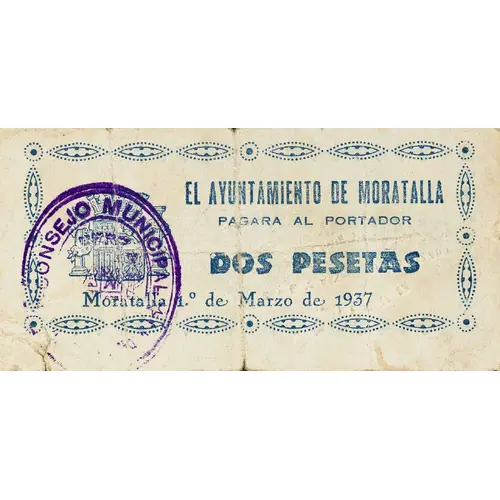 EL AYUNTAMIENTO DE MORATALLA PAGARA AL PORTADOR DOS PESETAS Moratalla 1.º de Marzo de 1937 (Translation: The City Council of Moratalla Will pay the bearer Two Pesetas Moratalla, March 1, 1937) |