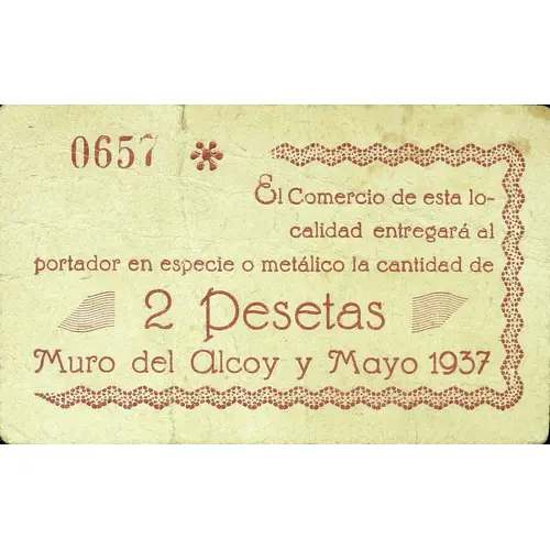 El Comercio de esta localidad entregará al portador en especie o metálico la cantidad de 2 Pesetas Muro de Alcoy y Mayo 1937 (Translation: The Commerce of this town will deliver to the bearer in kind or cash the amount of 2 Pesetas Muro de Alcoy and May 1937) |