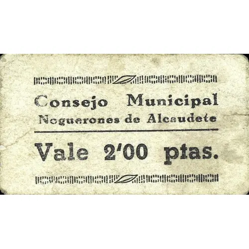 Consejo Municipal Noguerones de Alcaudete Vale 2`00 ptas. (Translation: Municipal Council Noguerones de Alcaudete It is worth 2.00 Pesetas) |
