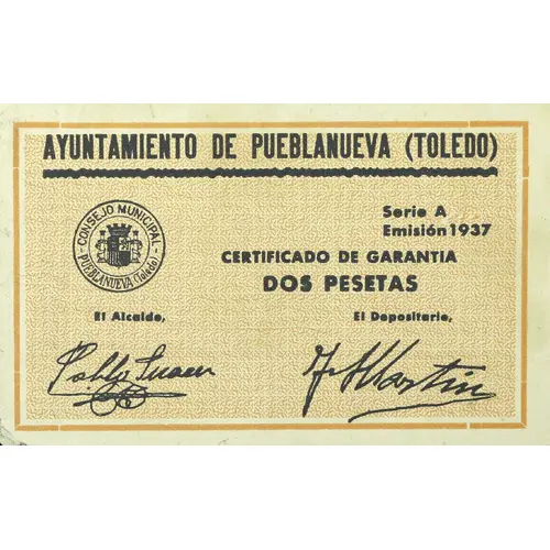 AYUNTAMIENTO DE PUEBLANUEVA (TOLEDO) Emisión 1937 CERIFICADO DE GARANTIA DOS PESETAS (Translation: City Council of Pueblanueva (Toledo) Issue 1937 Guarantee Certificate Two Pesetas) |