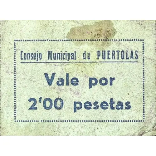 Consejo Municipal de PUERTOLAS VALE por 2`00 pesetas (Translation: Municipal Council of Puértolas Voucher for 2.00 Pesetas) |