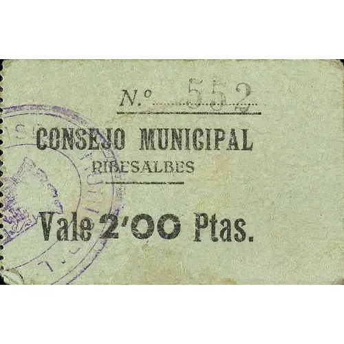 | Legenda del dritto | CONSEJO MUNICIPAL RIBESALBES Vale 2`00 Ptas. (Translation: Municipal Council Ribesalbes It`s worth 2.00 Pesetas) |