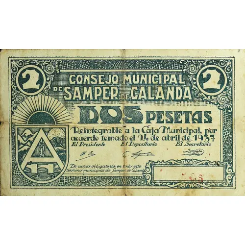 CONSEJO MUNICIPAL DE SAMPER DE CALANDA DOS PESETAS Reintegrable a la Caja Municipal, por acuerdo tomado el 24 de abril de 1937 De curso obligatorio en todo este término municipal de Samper de Calanda (Translation: Municipal Council of Samper de Calanda Two Pesetas Reimbursable to the Municipal Fund, by agreement made on April 24, 1937 Mandatory course throughout this municipality of Samper de Calanda) |