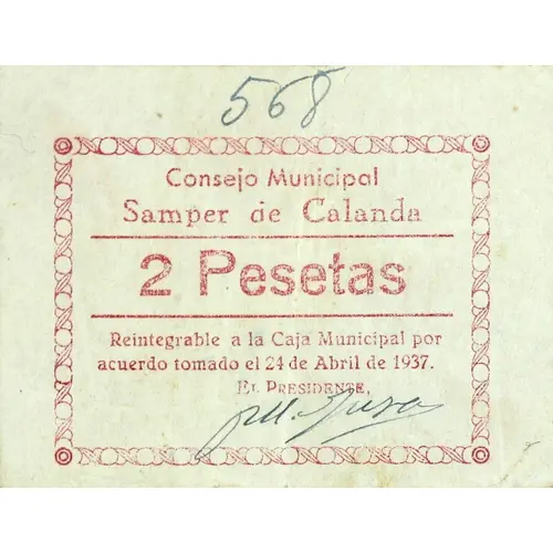 Consejo Municipal Samper de Calanda 2 Pesetas Reintegrable a la Caja Municipal por acuerdo tomado el 24 de abril de 1937. (Translation: Municipal Council Samper de Calanda 2 Pesetas Reimbursable to the Municipal Fund, by agreement made on April 24, 1937.) |