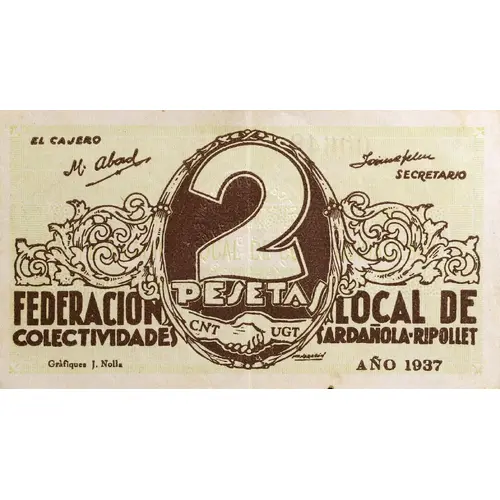 | Obverse lettering | EL CAJERO SECRETARIO 2 PESETAS FEDERACION LOCAL DE COLECTIVIDADES SARDAÑOLA-RIPOLLET C.N.T. U.G.T. Gràfiques J. Nolla AÑO 1937 (Translation: The Cashier Secretary Local Federation of Collectivities Confederación Nacional del Trabajo - Union General de Trabajadores) |