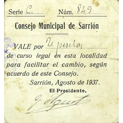 Consejo Municipal de Sarrión VALE por 2 pesetas de curso legal en esta localidad para facilitar el cambio, según acuerdo de este Consejo. Sarrión, Agosto de 1937. (Translation: Municipal Council of Sarrión Voucher for 2 Pesetas legal tender in this locality to facilitate the change, according to the agreement of this Council. Sarrión, August 1937.) |