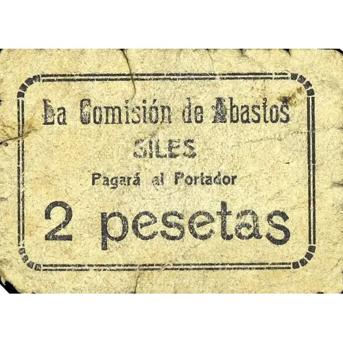 La Comisión de Abastos SILES Pagará al portador 2 pesetas (Translation: The Supply Commission Siles Will pay the bearer 2 Pesetas) |