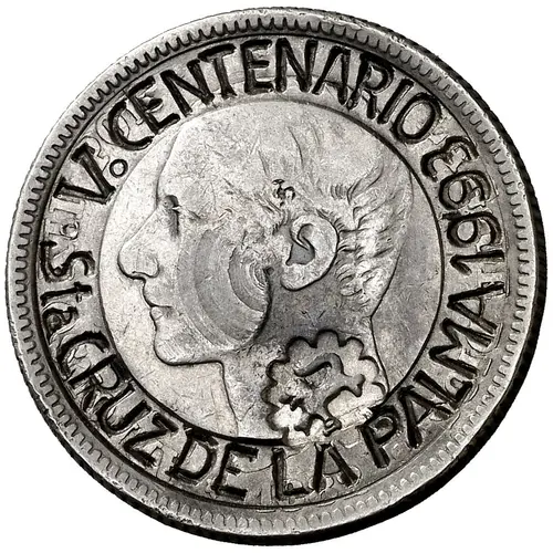 | Legenda del dritto | ALFONSO XII POR LA G· DE DIOS G· S· * 1882 * Sta CRUZ DE LA PALMA 1993. V CENTENARIO. |