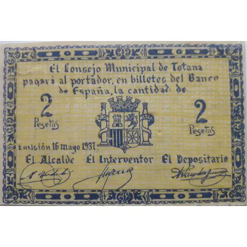 El Consejo Municipal de Totana pagará al portador, en billetes del Banco de España, la cantidad de 2 Pesetas Emisión 16 Mayo 1937. (Translation: The Municipal Council of Totana will pay the bearer, in banknotes of the Bank of Spain, the amount of 2 Pesetas Issue May 16, 1937.) |