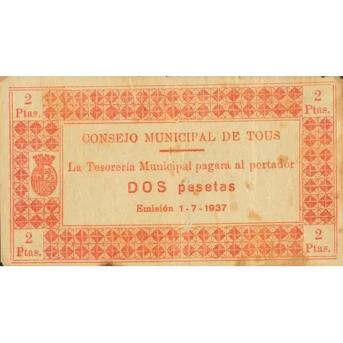 2 Ptas. CONSEJO MUNICIPAL DE TOUS La Tesorería Municipal pagará al portador DOS pesetas Emisión 1-7-1937 (Translation: 2 Pesetas Municipal Council of Tous The Municipal Treasury will pay the bearer Two Pesetas Issued July 1, 1937) |