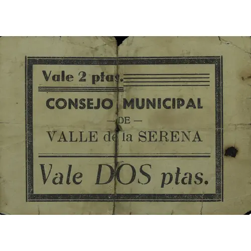 | Obverse lettering | Vale 2 ptas. CONSEJO MUNICIPAL DE VALLE DE LA SERENA Vale DOS ptas. (Translation: It`s worth 2 Pesetas Municipal Council of Valle de la Serena It`s worth Two Pesetas) |
