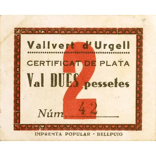 2 Vallvert d`Urgell CERTIFICAT DE PLATA Val DUES pessetes IMPREMTA POPULAR - BELLPUIG (Translation: Vallvert d`Urgell Silver Certificate It`s worth Two Pesetas) |