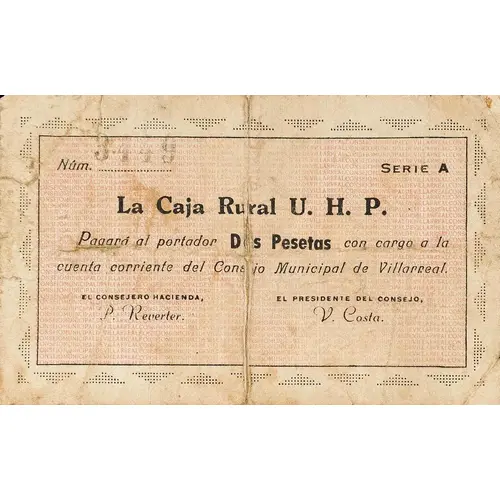 La Caja Rural U. H. P. Pagará al portador Dos Pesetas con cargo a la cuenta corriente del Consejo Municipal de Villarreal. (Translation: The Rural Fund U.H.P. Will pay the bearer Two Pesetas charged to the current account of the Municipal Council of Villarreal.) |