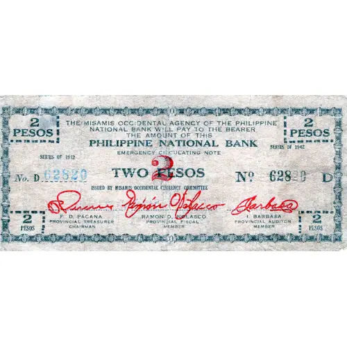 | Légende de l’avers | THE MISAMIS OCCIDENTAL AGENCY OF THE PHILIPPINE NATIONAL BANK WILL PAY TO THE BEARER ON DEMAND THE AMOUNT OF THIS PHILIPPINE NATIONAL BANK EMERGENCY CIRCULATING NOTE TWO PESOS ISSUED BY THE MISSAMIS OCCIDENTAL CURRENCY COMMITTEE |
