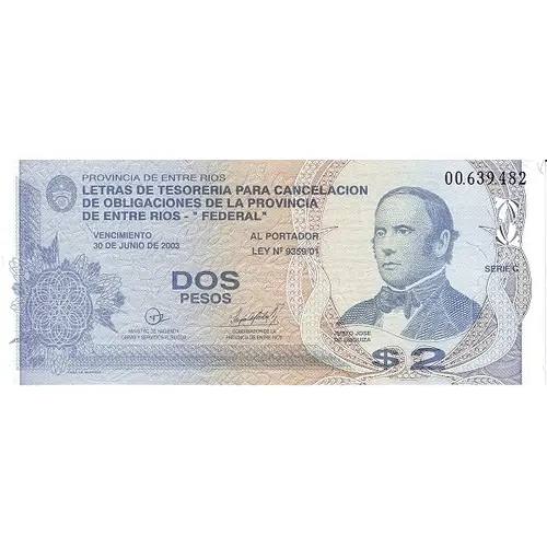 | Obverse lettering | PROVINCIA DE ENTRE RIOS LETRAS DE TESORERIA PARA CANCELACION DE OBLIGACIONES DE LA PROVINCIA DE ENTRE RIOS -- `FEDERAL` VENCIMIENTO AL PORTADOR 30 DE JUNIO DE 2003 LEY N° 9359/01 DOS PESOS (Translation: PROVINCE OF ENTRE RIOS TREASURY LETTERS FOR CANCELLATION OF OBLIGATIONS OF THE PROVINCE DE ENTRE RIOS - `FEDERAL` EXPIRATION TO THE CARRIER JUNE 30, 2003 LAW N ° 9359/01 TWO PESOS) |