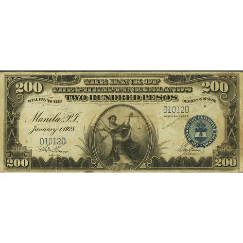 | Obverse lettering | THE BANK OF THE PHILIPPINE ISLANDS WILL PAY THE BEARER ON DEMAND TWO HUNDRED PESOS MANILA |