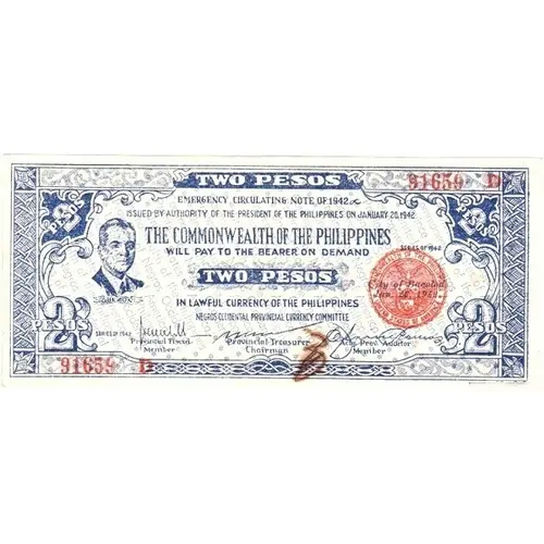 TWO PESOS EMERGENCY CIRCULATING NOTE OF 1942 ISSUED BY AUTHORITY OF THE PRESIDENT OF THE PHILIPPINES ON JANUARY 20, 1942 THE COMMONWEALTH OF THE PHILIPPINES WILL PAY THE BEARER ON DEMAND TWO PESOS IN LAWFUL CURRENCY OF THE PHILIPPINES NEGROS OCCIDENTAL PROVINCIAL CURRENCY COMMITTEE |