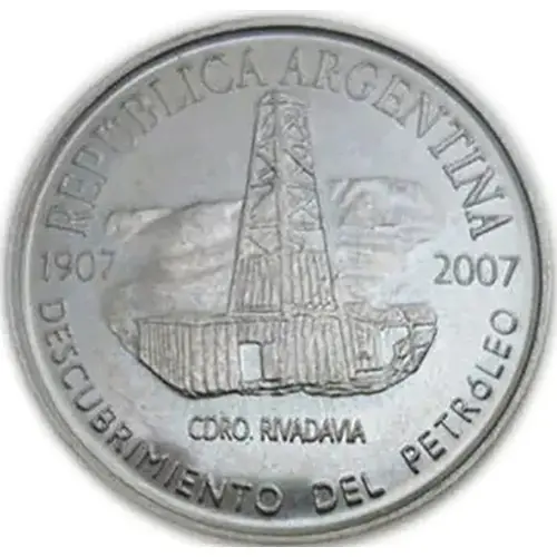 In the central imprint, in custody between the years referred to the centenary of the commemoration `1907` and `2007`, presents the image of the first oil extraction tower used opportunely and, below, the legend `CDRO. RIVADAVIA `. In the upper arch, read `REPÚBLICA ARGENTINA` and in the lower `DESCUBRIMIENTO DEL PETROLEO`. |