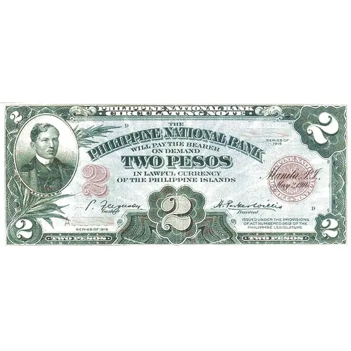 | Obverse lettering | PHILIPPINE NATIONAL BANK CIRCULATING NOTE THE PHILIPPINE NATIONAL BANK WILL PAY THE BEARER ON DEMAND TWO PESOS IN LAWFUL CURRENCY OF THE PHILLIPINE ISLANDS ISSUE UNDER THE PROVISIONS OF ACT NUMBER 2612 OF THE PHILIPPINE LEGISTATURE TWO PESOS TWO PESOS |