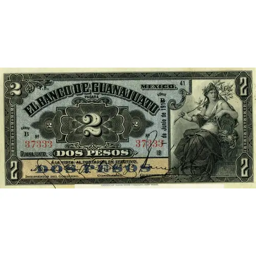 | Obverse lettering | El Banco de Guanajuato pagará a la vista al portador en efectivo Dos Pesos (Translation: The Bank of Guanajuato will pay the bearer with cash Five Pesos) |