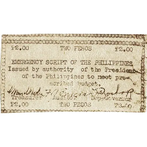 TWO PESOS EMERGENCY SCRIPT OF THE PHILIPPINES ISSUED BY AUTHORITY OF THE PRESIDENT OF THE PHILIPPINES TO MEET PRESCRIBED BUDGET TWO PESOS |