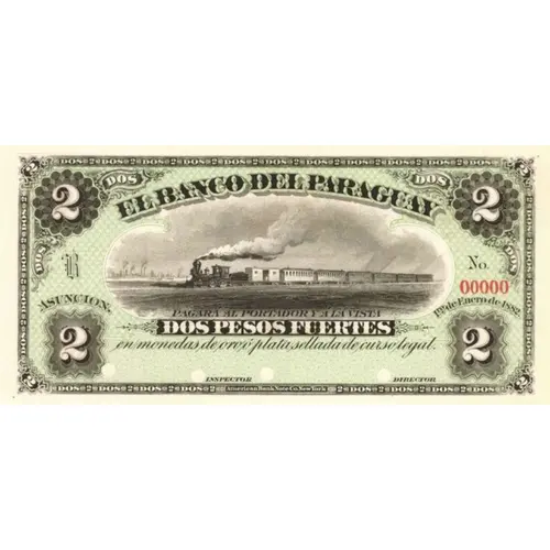 | Obverse lettering | EL BANCO DEL PARAGUAY ASUNCIÓN, 1ro. de Enero de 1882. PAGARÁ AL PORTADOR Y Á LA VISTA DOS PESOS FUERTES en monedas de oro ó plata sellada de curso legal. (Translation: The Bank of Paraguay Asunción, January 1st., 1882. Will pay to bearer, at sight, Two Pesos Fuertes in coins of gold or sealed silver, of legal tender.) |