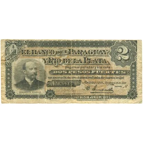 | Obverse lettering | EL BANCO DEL PARAGUAY Y RIO DE LA PLATA pagará al portador y á la vista DOS PESOS FUERTES en moneda de oro ó plata sellada de curso legal. Asunción, Deciembre 26 de 1889. LEY DE 25 DE JUNIO DE 1889. (Translation: The Bank of Paraguay and Silver River Will pay to bearer, at sight, Two Pesos Fuertes in coins of gold or sealed silver, of legal tender. Asunción, December 26th., 1889. Law of June 25th., 1889.) |