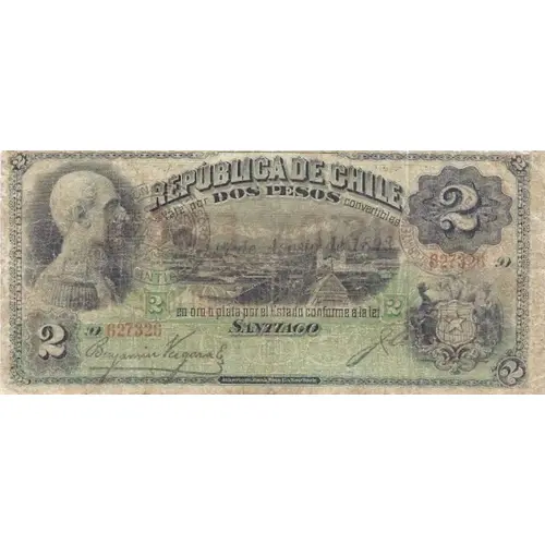 | Obverse lettering | REPUBLICA DE CHILE vale por DOS PESOS convertibles 17 de Agosto de 1898. en oro ó plata por el Estado conforme á la lei. SANTIAGO American Bank Note Co., New York (Translation: Republic of Chile worth Two Pesos convertible August 17, 1898. into gold or silver by the State in accordance with the Law. SANTIAGO American Bank Note Co., New York) |