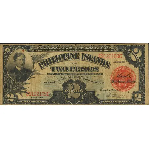 TREASURY CERTIFICATE BY AUTHORITY OF AN ACT OF THE PHILIPPINE LEGISTATURE APPROVED BY THE PRESIDENT OF THE UNITED STATES JUNE 13, 1922 THIS CERTIFIES THAT THERE HAS BEEN DEPOSITED IN THE TREASURY OF THE PHILIPPINE ISLANDS TWO PESOS PAYABLE TO THE BEARER ON DEMAND IN SILVER PESO OR IN GOLD COIN OF THE UNITED STATES OF EQUIVALENT VALUE TWO PESOS TWO PESOS |