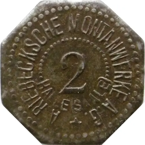 | Obverse lettering | A. RIEBECKSCHE MONTANWERKE A.-G. 2 HALLE (SAALE) ★ |