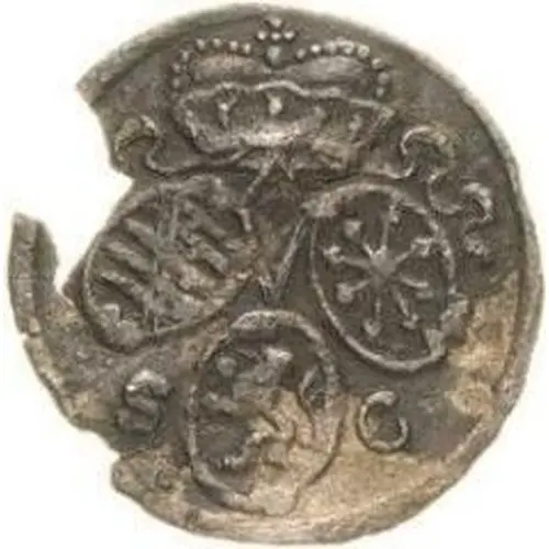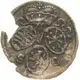 Descrição do anverso 3 small oval shields of arms, crown above, mintmark below.