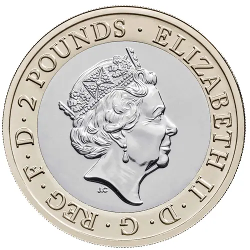 | Obverse lettering | ELIZABETH II·D·G·REG·F·D·2 POUNDS · J.C (Translation: Elizabeth the Second by the Grace of God Queen Defender of the Faith) |