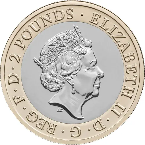 | Obverse lettering | ELIZABETH II·D·G·REG·F·D·2 POUNDS· J.C (Translation: Elizabeth the Second by the Grace of God Queen Defender of the Faith) |