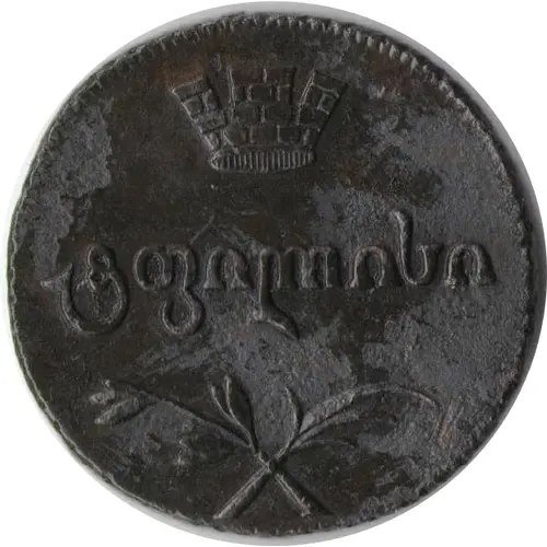| Reverse description | Denomination in Persian Dinars, but by Georgian lettering. ` ი ` = 10 (Dinars) 2-line Georgian inscription in the center Lettering year by Georgian lettering |