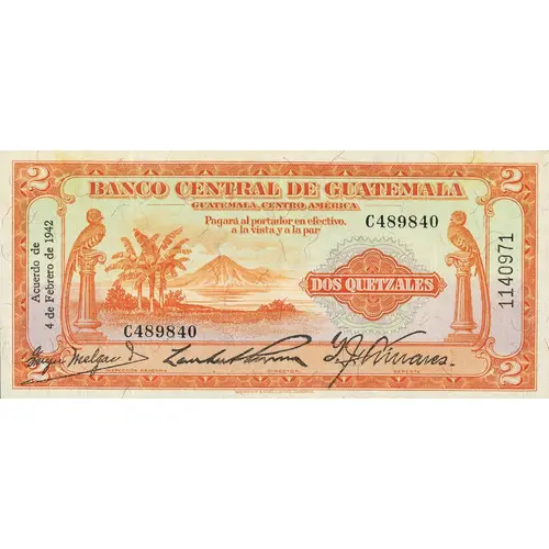 | Obverse lettering | BANCO CENTRAL DE GUATEMALA GUATEMALA, CENTRO AMÉRICA Pagará al portador en efectivo, á la vista y á la par DOS QUETZALES Acuerdo de 4 de Febrero de 1942. (Translation: Central Bank of Guatemala Guatemala, Central America Pay to Bearer at sight in cash Two Quetzals According February 4th., 1942.) |