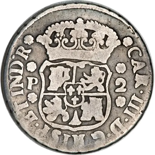 | Obverse lettering | * CAR • III • D • G • HISP • ET IND • R * * P * * 2 * (Translation: Carlos III King of Spain and the Indies by the grace of God P 2 Reales) |