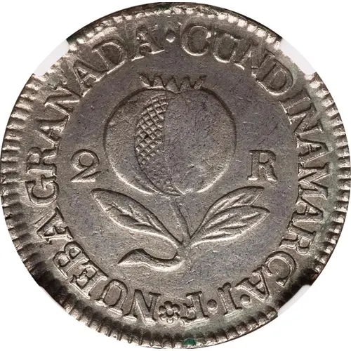| Obverse lettering | NUEVA GRANADA·CUNDINAMARCA·J·F 2 R (Translation: 2 Reales) |